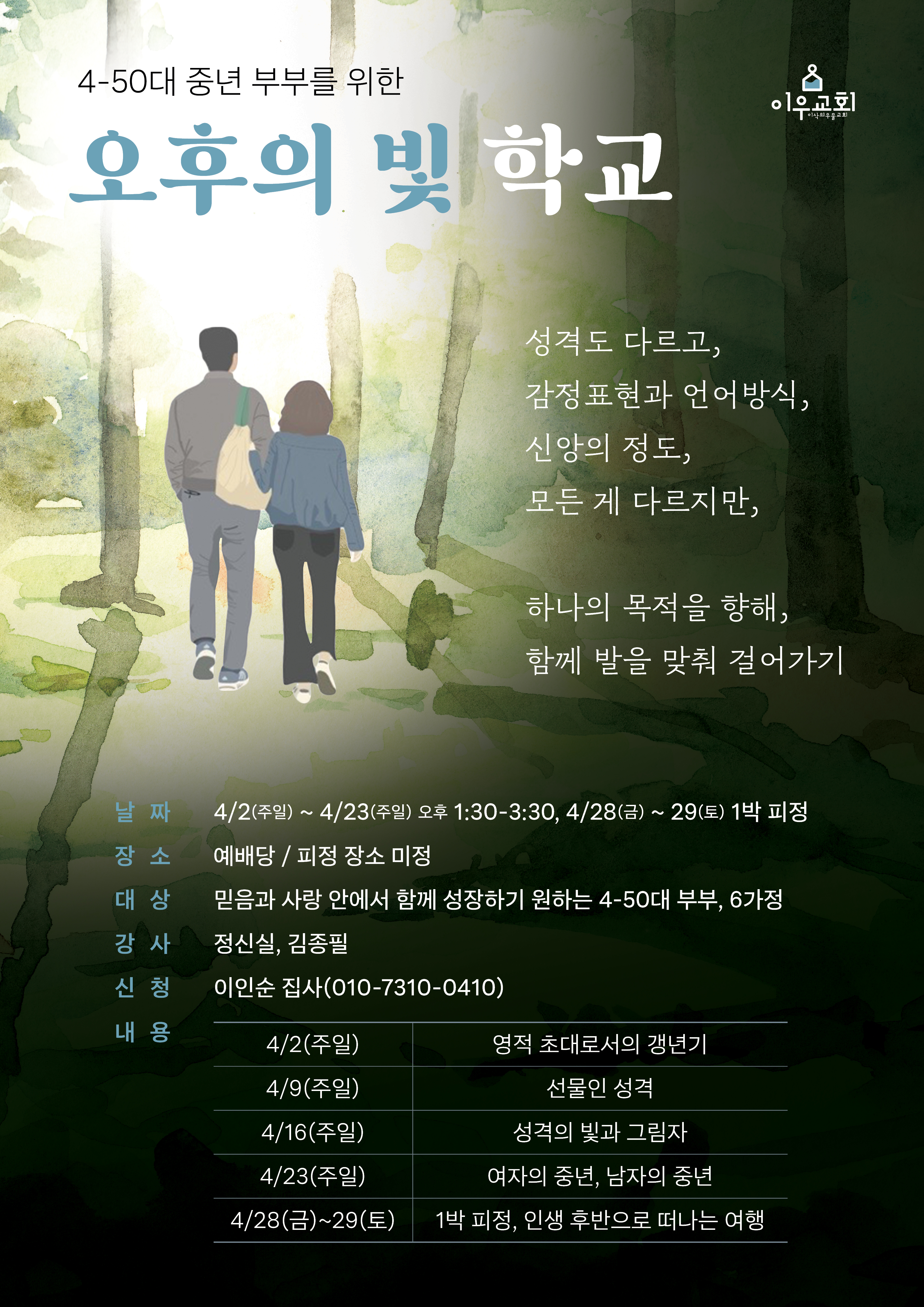 4월 한 달 "오후의 빛 학교"라는 이름으로 중년 세미나를 하고 있다. 공식적으로는 "중년 부부 인생 학교"라고 불러야 하겠지만, 내게는 "중년의 영성 학교"이다. 교회 집사님들 여섯 커플과 가볍게 즐겁게 (나는 혼자) 깊게 가고 있다. 이름은 <시니어 매일 성경>에 연재하는 "生, 노을이 물드는 시간"에서 따왔다. 그 연재 글은 물론 여기저기서 하고 있는 강의를 갈아 넣어 4주간의 강의와 나눔, 1박 2일 피정으로 진행한다. 포스터은 우리 연구소의 하늘 샘이자, 우리 교회 사랑스런 청년 다슬의 작품이다. 발로 만들어도 고퀄, 발로 만들어도 마음을 담는 특별한 기술을 가진 자이다. 아, 글쎄 포스터의 뒷모습 중년부부는 누가 봐도 딱 아는 그들이고!
