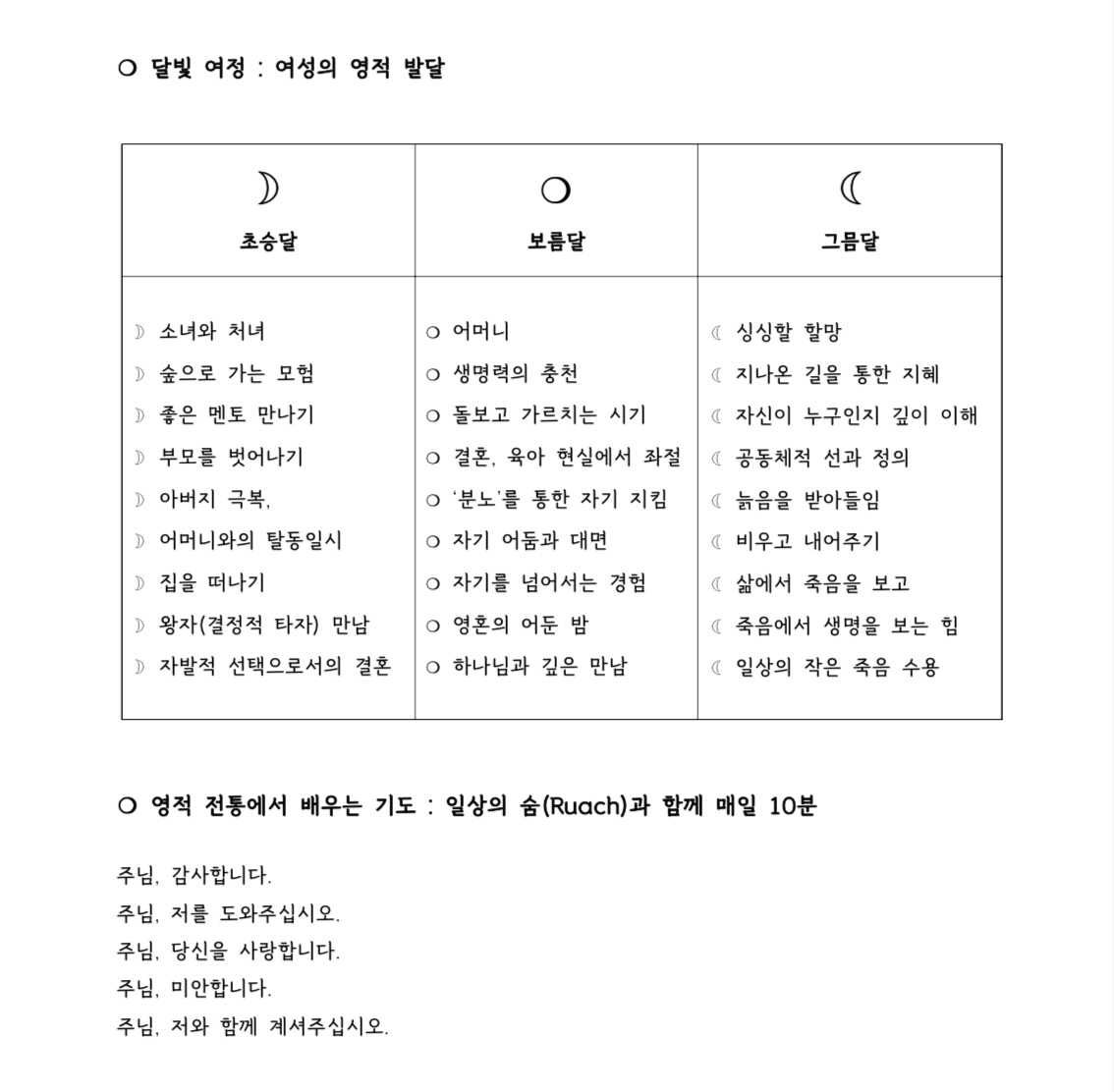 초승달-보름달-그믐달로 여성의 영적 발달을 설명하는 박정은 수녀님의 《사려 깊은 수다》를 길잡이 삼아 “달빛학교”라는 이름의 여성 영성 모임을 진행했다. 30대 비혼 청년부터 60대 권사님까지, 삶의 배경과 신앙의 컬러까지 다양한 일곱 명의 여성과 함께했다. 연구소나 상담소의 프로그램에서는 만들어지기 어려운 집단이다. 교회니까, 교회라서 가능한 비균질 집단인 것 같다. 교회에서 진행하고 있는 생애 주기에 따른 일상영성 세미나 “인생의 빛 학교” 중 하나다.