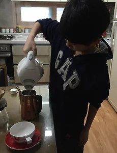 우리집 강아지는 바리스타 강아지 ♪ 핸드드립은 커피의 맛과 향을 가장 잘 담아내는 추출방법이고, 느림의 미학을 몸으로 느끼게 하고, 지금 여기에 깨어있도록 하는 영성적 도구....... 다 좋은데. 귀찮은 게 문제다. 물 끓이고, 잔 데우고, 원두를 갈고, 여과지를 접고, 1차 2차 추출...... 엄마 아빠 소파에 앉아 있다가 '현승아~' 하고 부르면. 우쒸, 싫어. 커피 준비 안해. 내가 그럴 줄 알았어. 조마조마 했어. 왠지 커피 준비하라고 할 줄 알았어. 하다가도. 투덜투덜, 드륵드륵, 쫄쫄쫄쫄..... 그래서 우리집 강아지는 바리스타 강아지이다. 원고도 안 풀리고 마음도 싱숭생숭한 엄마가 멍 때리고 있으니까 엄마, 내가 커피 준비해줄까? 짜증 안 내고 한 번 준비해줄게. 나 이제 드립만 배우면 ..